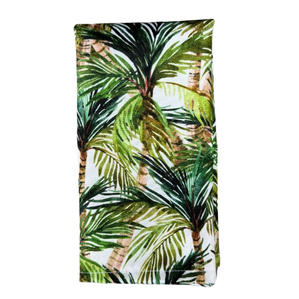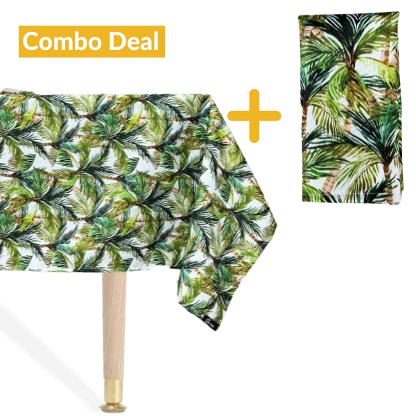 Elevate your dining setting with the serene beauty of our Palm Breeze tablecloth. Showcasing delicate palm leaves in various shades of green against a crisp white backdrop, this design brings a fresh and tranquil touch to any space.