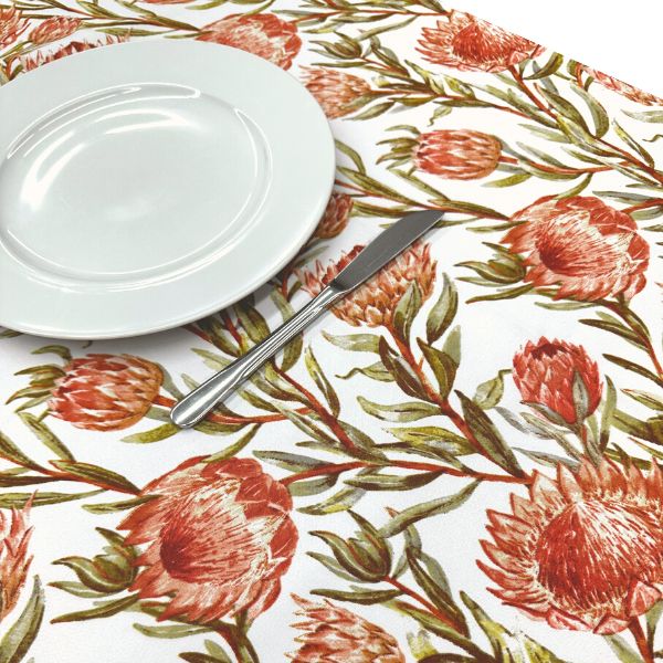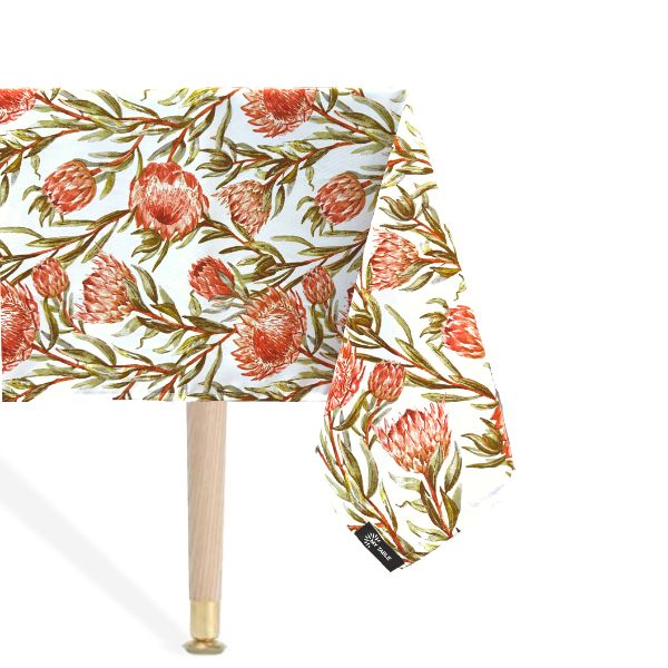 My Table SAA Gorgeous Blushed Protea on a chalk white background, is the perfect neutral addition to your tablecloth collection.