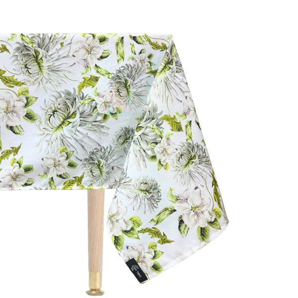 My Table SAFeatures soft white and sage tones in a delicate floral design. With its gentle green accents and airy botanical feel, this Crysanthemum print brings a fresh, elegant look to any table setting — perfect for garden lunches, bridal showers, or everyday dining with a refined touch.