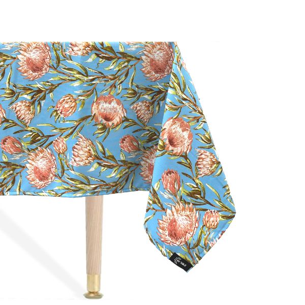 My Table SAA Gorgeous Blushed Protea on a cool light blue background, is the perfect soft pretty addition to your tablecloth collection.