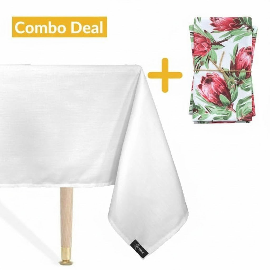A crisp white feel fabric with with our Famous Pink Ice Protea on white napkins, perfect to use as a base with a pop or colour of our calming pine cone napkins for a warm feel!