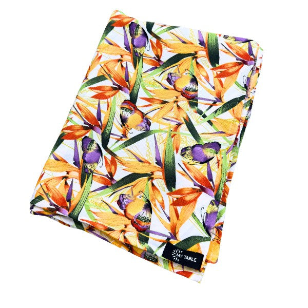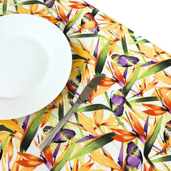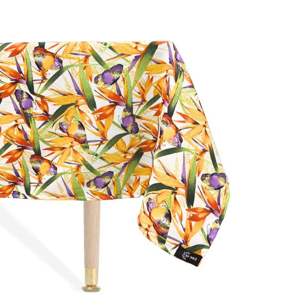My Table SATangerine Orange with shades of green and purple, a fresh and summery tablecloth on a white background