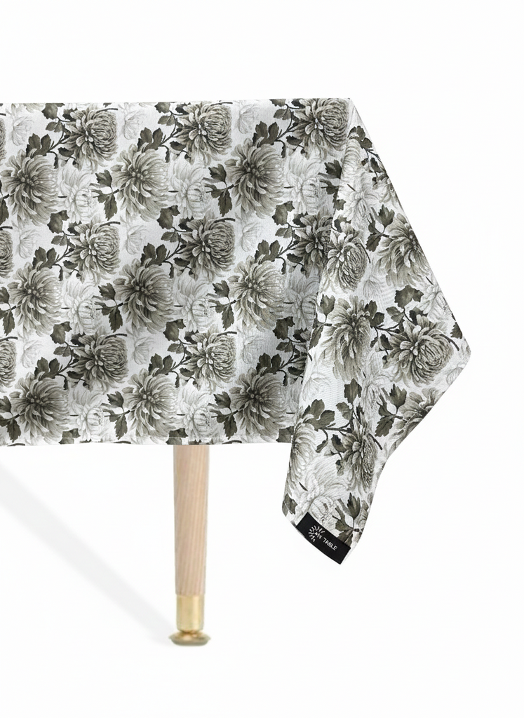 My Table SAFeatures soft white and greige(grey/beige) tones in a delicate floral design. With its greige accents and airy botanical feel, this Crysanthemum print brings a fresh, elegant look to any table setting — perfect for garden lunches, bridal showers, or everyday dining with a refined touch.